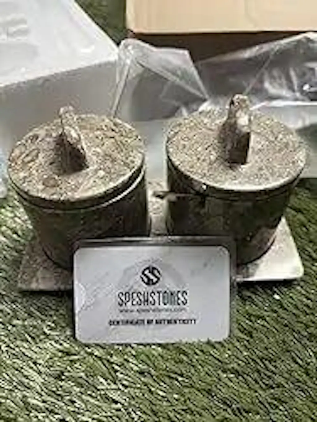 - 2 marble lids — one per jar, fitted to keep moisture out and contents dry