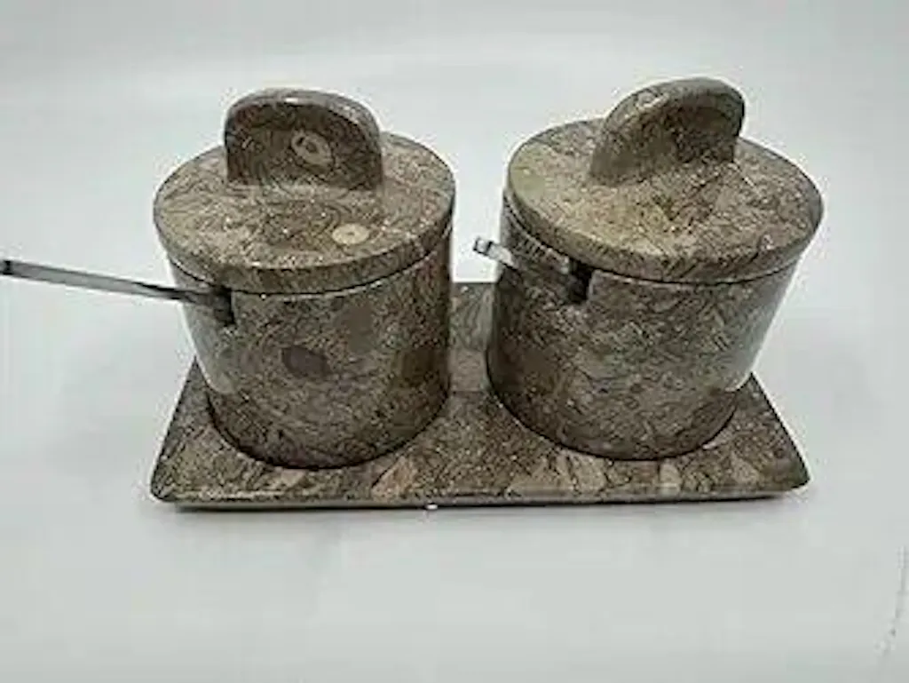 - Individual marble lids — each jar has its own fitted marble lid that keeps moisture out and salt or sugar dry between uses. The lids are marble — no plastic parts anywhere in the set